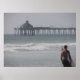 A boogie boarder gets ready for the plunge at Imperial Beach. The IB Pier created the backdrop. Taken in 2006. There's an American Flag on top of the building at the pier's end.