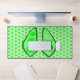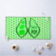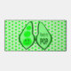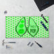 This awesome desk mat features a graphic image of a green Pea pod containing 3 green peas. The largest pea has a cute little face with eyes and a mouth. On the other side of the pea pod in darker green text it says "Ready to Pop".