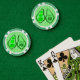 This awesome set of poker chips features a graphic image of a green Pea pod containing 3 green peas. The largest pea has a cute little face with eyes and a mouth. On the other side of the pea pod in darker green text it says "Ready to Pop".