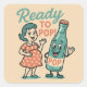 "READY TO POP!" This absolutely charming retro 1950s-inspired design features a sweet pregnant woman in a coral polka dot dress standing next to a cheerful anthropomorphic soda pop bottle—both ready to pop! The vintage cartoon aesthetic, warm nostalgic color palette, and playful pun create the perfect celebration of expectant motherhood.