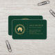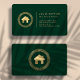 This real estate business card features a faux gold house logo framed by a circular Greek key motif on the left and simple, gold-colored sans serif text on the right, with a vertical line between, on a dark green rounded background. A larger version of the house logo appears on the reverse side.