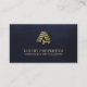 Professional, elegant realtor real estate agent modern minimalist luxury upscale dark navy blue leather look (PRINTED) business card with faux gold metallic house and key logo and custom scannable QR code for contact, evaluation, or to see listing.