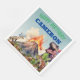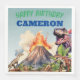 These custom birthday party napkins feature a prehistoric theme with realistic looking dinosaur illustrations. An image of an exploding volcano is pictured at the bottom, with three dinosaurs roaming in front of it. A scary, angry tyrannosaurus rex is seen running up from behind. A sample "Happy Birthday" message and name are printed at the top. You can personalise the napkin to include your own custom name or text.