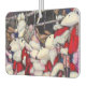 Original whimsical painting of Holiday Dollys by well-season Fine Art Artist, Gaye Elise Beda. A gathering of anthropomorphic mice is dressed in festive, holiday-themed clothing. Their bright red outfits and striped socks create a joyful and playful scene, with each mouse uniquely adorned. The background suggests a wintry setting, enhancing the festive mood.