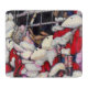 Original whimsical painting of Holiday Dollys by well-season Fine Art Artist, Gaye Elise Beda. A gathering of anthropomorphic mice is dressed in festive, holiday-themed clothing. Their bright red outfits and striped socks create a joyful and playful scene, with each mouse uniquely adorned. The background suggests a wintry setting, enhancing the festive mood.