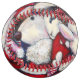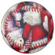 Original whimsical painting of Holiday Dollys by well-season Fine Art Artist, Gaye Elise Beda. A gathering of anthropomorphic mice is dressed in festive, holiday-themed clothing. Their bright red outfits and striped socks create a joyful and playful scene, with each mouse uniquely adorned. The background suggests a wintry setting, enhancing the festive mood.