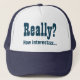 Funny slogan on a hat that says "Really? How Interestzzz.". Show people how much you care (or don't) about what they're saying. Very dark blue wording. Really interesting hat.