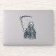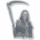 The Grim Reaper sits idly with his chin resting on his palm, his scythe in the other hand, overcome with boredom.