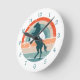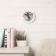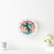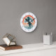 On this attractive clock, a teal blue silhouette rearing horse is placed on a retro style circle rainbow background of distressed stripes. Matching teal numbers make the clock easy to read.
