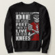 Monochrome skeleton in a red shirt, handgun in hand, paired with bold distressed text for an edgy streetwear statement.