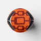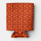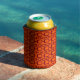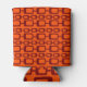 This can cooler has a mid-century modern design of maroon rounded rectangles connected together on a field of orange.