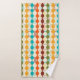 This towel set has a turquoise washcloth, a green hand towel, and a bath towel with a mid-century modern design of rounded rectangles with holes as a background with rounded chains in the foreground all in MCM colours. If you like the design but prefer different colours, message me.