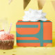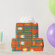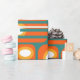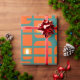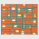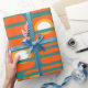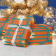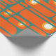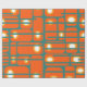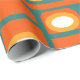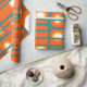 This wrapping paper has a mid-century modern design of orange rectangles with white and gold circles in them and teal horizontal lines crossing them on a field of teal.