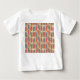 This baby t-shirt has a geometric design of rectangles in tan, grey, and off-white making the background with ovals in brick red overlaying them.