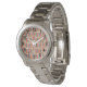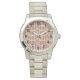 This women's watch has a geometric design of rectangles in tan, grey, and off-white making the background with ovals in brick red overlaying them.