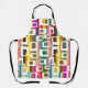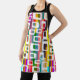 This apron has a mid-century modern design of rectangles with holes on a field of stripes.