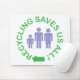 Blue silhouettes of a man, woman and child surrounded by the caption "Recycling Saves Us All" in a circle on Men's Earth Day T-shirts, Women's Earth Day Shirts, Kids Earth Day Shirts, Earth Day Buttons, Aprons, Key Chains and more Gifts. Also great gifts for America Recycles Day in November.