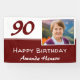 Red 90th Birthday Party Photo Backdrop Banner. This modern 90 years milestone birthday backdrop is in dark red and white colours. Add your photo, personalise with your name and any text on the banner.