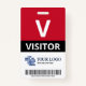 Vertical visitor badge with a large V against a white background. Visitor beneath in clean letters. Add your logo and bar code. Visitor badge personalised with logo and barcode in a minimalist design in red, white, and black.