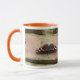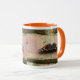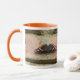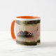 This stunning mug features a photograph of a beautiful Red Admiral Butterfly (Vanessa atalanta). This species is mainly black with white spots and beautiful red bands on its wings. The photo shows the butterfly, with its wings wide open, resting on a brick wall looking at the camera. The photograph was taken using macro photography for a detailed result.