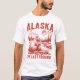 This white t-shirt features a monochromatic red sketch-style illustration of a mother grizzly bear and her cub sitting by a river in an Alaskan wilderness scene. Mountains, trees, and a setting or rising sun are depicted in the background. The word "ALASKA" is printed in bold red at the top, and "THE LAST FRONTIER" is in smaller red letters at the bottom.