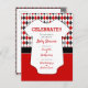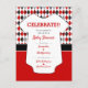 Oversized elegant argyle pattern in school colours of red and black set the backdrop for this cute baby shower design. A white baby bodysuit has all the text written on it for the big event, which can be a couples shower or just for mum. Design comes in maroon and grey, burnt orange and grey, red and black, green and black, orange and navy, green and yellow, and purple and grey. Matching products available.