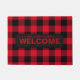 This mat features black and red buffalo check with a red monogram family name and "Welcome" text on a black faux burlap background Personalise with your own name or to give as a gift.