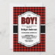 It’s a boy! Red and black buffalo plaid baby shower invitation.