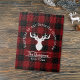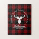 The product design features a silhouette of a reindeer on a classic red and black buffalo plaid pattern. Combined with your own personalised text, this composition makes a farmhouse, modern, and unique family name jigsaw puzzle.