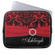 This personalised red and black damask laptop sleeve with a red FAUX ribbon and jewel brooch has a text box for you to customise with your own name, monograms, business name, or other text. If you need any help customising it the way you want, please email niteowlstudio@gmail.com for help.