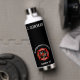 Stylish water bottle features red generic fire department logo on black background. Customize with city or county department details and firefighter name in modern white font.
