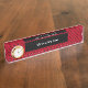 Small black polka dots on a red background name plate. The design features a black polka dot on red and a black rectangle in the middle with your custom name.