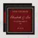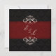 Custom monogrammed wedding "Save the Date" cards printed with red and black vintage damask patterns on shimmering metallic paper will give your winter wedding the perfect touch of understated elegance.