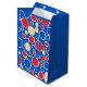 Medium Size Party Gift Giving Bag printed with Red And Blue Dots On Blue and creamy tan natural wood colour background artwork design illustration by TheFabricSeal at Zazzle. #ZazzleMade https://www.zazzle.com/store/thefabricseal