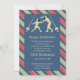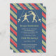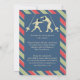 A cool blue, green and red fencing birthday invitation. Great for teenagers and kids that are into sword fighting and fencing and want a spectacular birthday theme. The invitation has a duelling pair on the front and two epees. Very fun for kids that are brave and mighty.