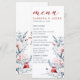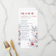 This elegant wedding menu card features a sophisticated botanical aesthetic that balances traditional romance with a clean, modern layout. It is a perfect choice for couples seeking a refined, timeless look for their reception tables. The right side is adorned with a delicate watercolor bouquet of soft pink and white peonies, accented by deep red berries and dusty blue eucalyptus-style leaves.