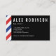 A patterned business card for a barber featuring red and blue stripes on a white background. On one side, the design covers the whole area of the card with a space for appointment details in the center and on the other side, there's a narrow stripe down one edge leaving plenty of room for your name and details in white text on a black background.
