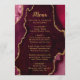 Create a striking presentation with this burgundy red and gold agate marble menu, perfect for wedding receptions and versatile enough for stylish multi-purpose use. Rich wine and crimson tones, organic stone-inspired textures, and shimmering gold accents come together to create a refined yet dramatic look that pairs beautifully with fall or winter celebrations. Designed to complement elegant, modern, and glamorous events, this agate-inspired menu can be customized for wedding dinners, cocktail hours, dessert tables, or upscale event and restaurant menus, offering timeless sophistication that extends well beyond the wedding day.