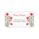 A custom large address or business label with etched and block letters and baroque art of daisies and curling leaves in red and golds, restored from an antique manuscript.