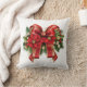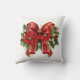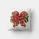 A pillow with a festive Christmas bow in red and gold. Surrounded by poinsettia flowers, pine and Christmas decorations.