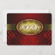 Red and gold graduation invitation with light and dark red stripes and a gold ribbon going across showing the year of graduation. The back of the card is red with light gold font for people to fill in the graduation party invitations.