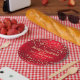 Red and gold confetti pattern Christmas paper plate. The design features a nice gold pattern on a red textured background.