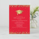 This modern design features a graduation hat and confetti in gold on a background of red with white text.