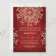 A beautiful deep red ruby garnet and gold hued wedding invitation with an exotic Indian inspired ornamental sari medallion pattern with a floral and lotus design. This elegant and beautiful modern Indian style wedding invite is perfect for an engagement party or anniversary party too with an Indian Moroccan east asian or Indonesian theme. Designed by Chrissy H. Studios, LLC. All Rights Reserved.