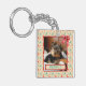 Cute keychain has a background of red and green leaping reindeer and snowflakes. You upload your favourite photo of your pet or child with the easy to use template provided. Your photo will be bordered with a red stripe and there is a pretty red bow in the corner. The reverse side of the keychain has the red and green reindeer and snowflake pattern. This would make a cute stocking stuffer for a family member.