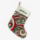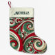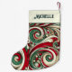 This personalised name Christmas stocking has a fun red and green swirl pattern with circle accents.