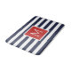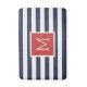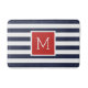 Custom monogrammed bath mat with a preppy stripe pattern in navy blue, red and white colours. Personalise it with your monogram initial in a square frame. Use the design tools to choose any background colours, edit the text fonts and colours and add your own photos to create a one of a kind design to match any bathroom decor.