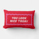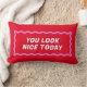 Simple and fun, this dual sided red and bright pink lumbar pillow features a wavy rectangle and two different but coordinating sides with friendly text reminders to spread positivity in your life and your home. You can change the text for your own custom message too!