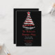 A red and silver christmas tree on a black background. The back of the invite is black with snow pattern