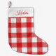 Trendy red and white buffalo plaid pattern, Christmas stocking. Features white colour block at top with template line in red cursive for name or initials.